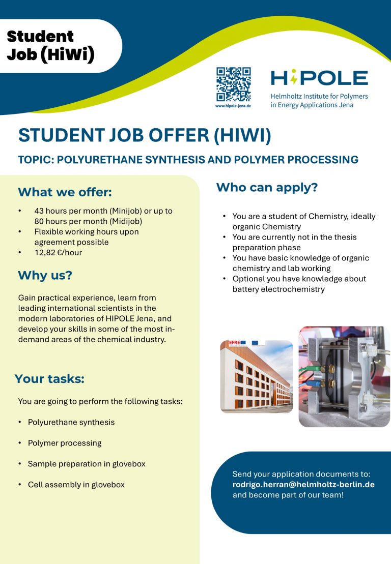 Job offer Job (HiWi) for students in organic and polymer chemistry (Dr. Rodrigo Herran) Apply via rodrigo.herran@helmholtz-berlin.de and become part of our innovative team!