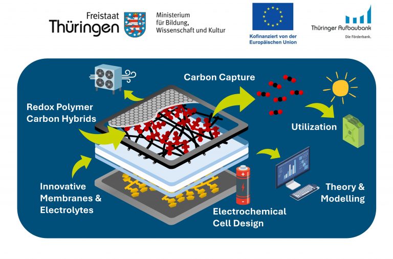The required expertise in materials synthesis, process engineering, modeling, and testing of carbon dioxide utilization scenarios based on renewable energies is brought together by the participating research groups of Prof. Oschatz, Prof. Mollenhauer, Jun.-Prof. Pannwitz, Prof. Schacher, and Prof. Schubert.