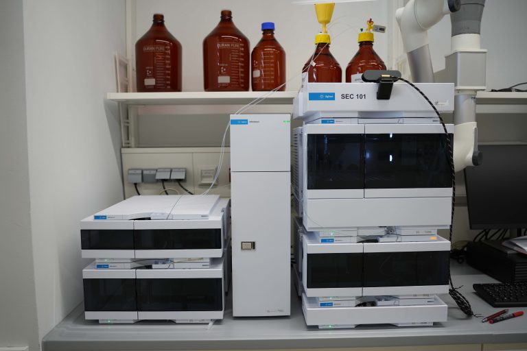 Für die Forschung an Polymeren werden analytische Trennungen von Verbindungsgemischen mit einem Hochleistungsflüssigkeitschromatographie-System (HPLC) durchgeführt.