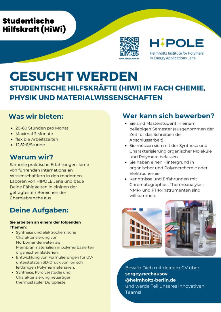 Stellenanzeige Job (HiWi) für Studierende der Organischen Chemie, Polymerchemie oder Elektrochemie (Dr. Sergey Nechausov) Bewirb Dich über sergey.nechausov@helmholtz-berlin.de und werde Teil unseres innovativen Teams!